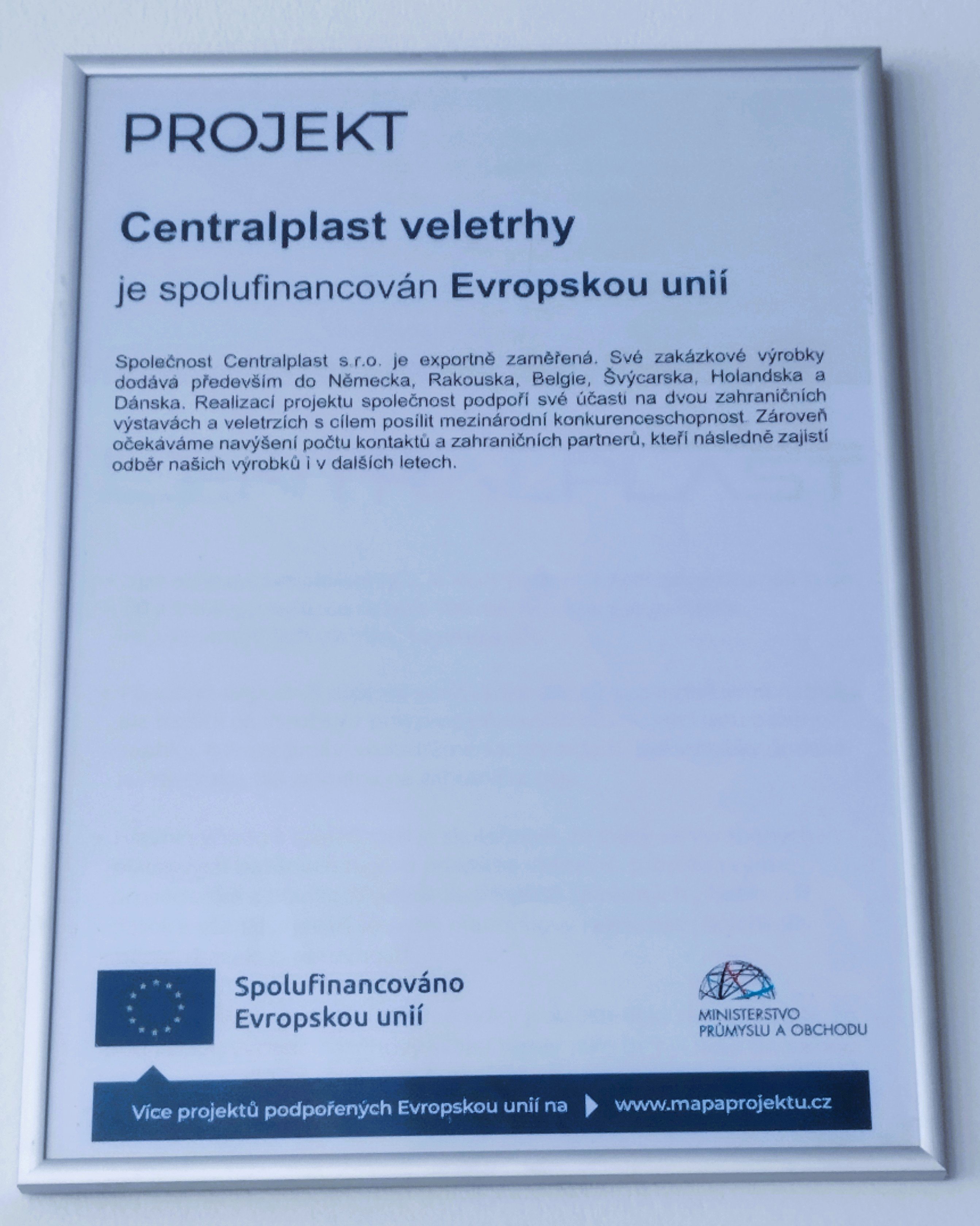 - CÍL: Společnost Centralplast s.r.o. je exportně zaměřená. Své zakázkové výrobky dodává především do Německa, Rakouska, Belkgie, Švýcarska, Holandska a Dánska. Realizací projektu společnost podpoří své účasti na dvou zahraničních výstavách a veletrzích s cílem posílit mezinárodní konkurenceschopnost. Zároveň očekáváme navýšení počtu kontaktů a zahraničních partnerů, kteří následně zajistí odběr našich výrobků i v dalších letech.